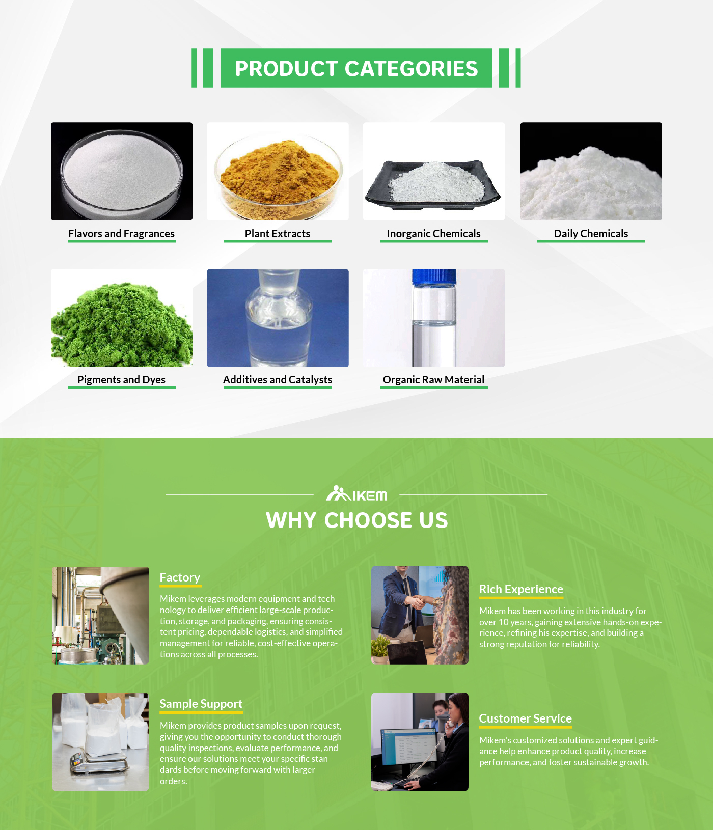 मुख्य उत्पादों: अकार्बनिक रसायन, दैनिक रसायन, रासायनिक कच्चे माल, एडिटिव्स और उत्प्रेरक, पौधे के अर्क